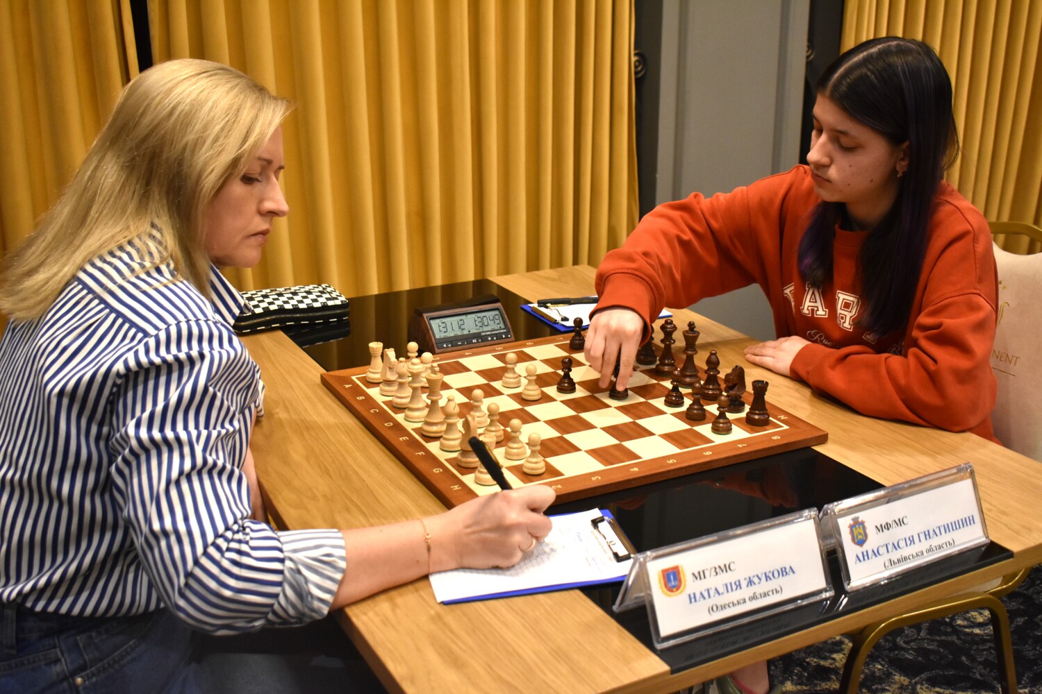 Анастасія Гнатишин: Я теж не мала. Поразка означала б для мене виліт. Так, нічия була прийнятною, але я завжди граю на перемогу. Це була дуже напружена партія. Наталія мала перевагу, бо грала білими. Але на цьому турнірі мені давалася гра чорними. Звісно, перед Ужгородом підготувала разом зі своїми тренерами Володимиром Грабінським і Адріаном Михальчишиним заготовки під всіх суперниць, але вже в ході змагань вносила корективи, відштовхуючись від попередніх партій. Можу сказати, що моя тактика на поєдинок з Жуковою спрацювала: міцний дебют, потім тривалий час рівна позиція, а в ендшпілі змогла використати помилку Наталії.