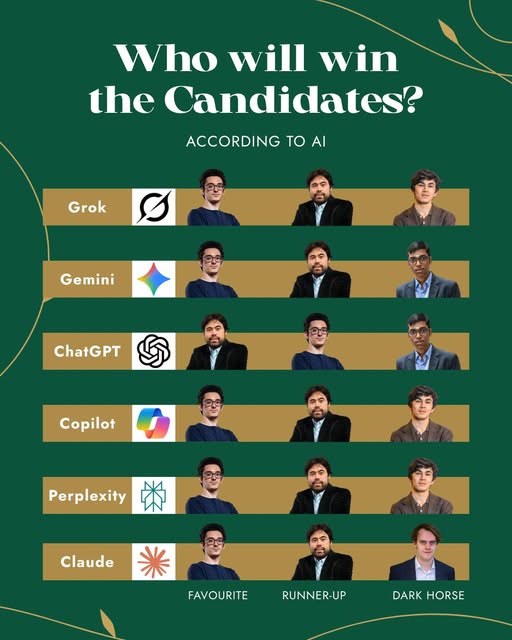 Напередодні Турніру претендентів 2026 року організатори опитали популярні ШІ-моделі (Grok, Gemini, ChatGPT, Copilot, Perplexity, Claude), щоб спрогнозувати переможця.
