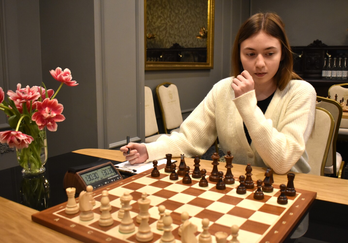 На виході з дебюту Тетяна мала явно кращу позицію, але перевагу розгубила. Позиція вирівнялася, та під перший контроль Скарбарчук вдалося виграти пішака і перевести партію в закінчення, в якому були тура і кінь проти тури і коня та два пішаки проти одного на одному фланзі – а і b проти а. Цей нюанс зіграв величезну роль, бо чимало ендшпілів, які могли виникнути – коневий, туровий – мали бути нічийними. І навіть пішаковий. Все тому, що пішак у білих стояв на а2, не рухався з початкової позиції. Тетяна намагалася довести партію до відчутної переваги, пробувала різні варіанти. Але Божена чітко захищалася, і партія завершилася справедливою нічиєю.
