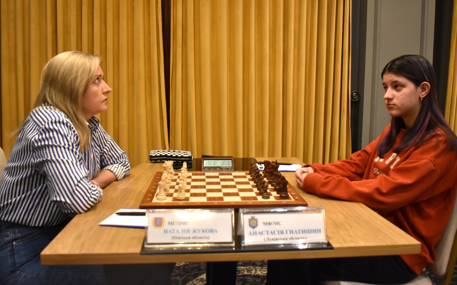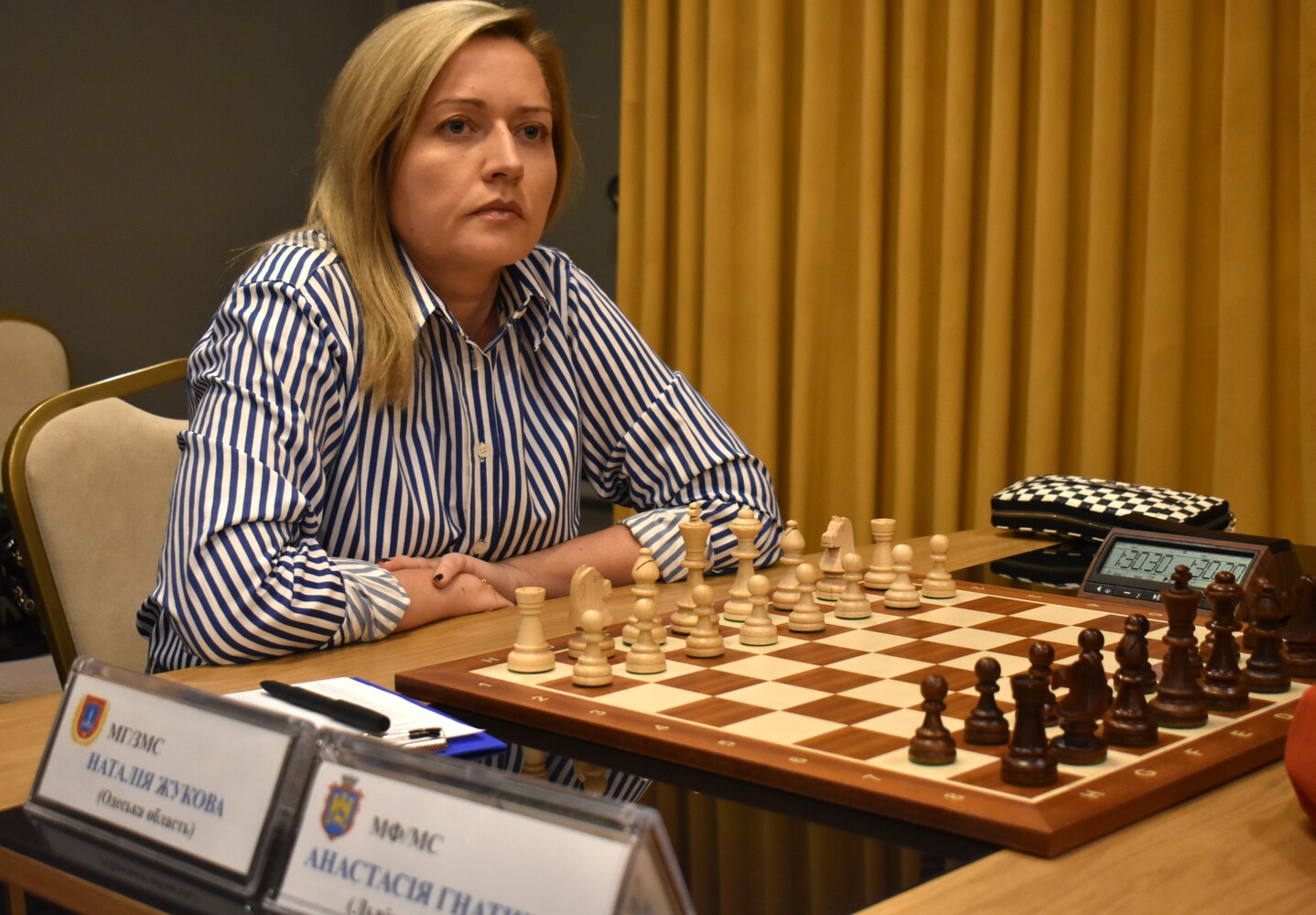 Це була одна з ключових партій змагання. З турнірної ситуації виглядало, що Наталія намагатиметься перемогти. Суперниці закрили позицію, точилася дуже рівна стратегічна боротьба. У районі 30-го ходу Наталія поступово почала заходити в цейтнот – на її годиннику залишалося в межах чотирьох хвилин. На ту мить Анастасія мала перевагу три на два пішака на ферзевому фланзі, а Наталія мала прохідного пішака d. Кожна з суперниць мала свої плани: чорні прагнули реалізувати пішакову перевагу на ферзевому фланзі, а білі мали великі сподівання на центрального прохідного. Й ось за такої ситуації Жукова зробила, на перший погляд, непомітний і начебто логічний хід королем у центр. Але виявилося, що цей хід був невдалим. Фігури Гнатишин швидко з ферзевого флангу перекинулися на королівський. Позиція короля виявилася дуже вразливою. Анастасія дуже швидко створила чисельні загрози – і це виявилося вирішальним. Партія завершилася до контролю. Це була дуже якісна партія від Гнатишин, яка обіграла титуловану суперницю і стратегічно, і тактично.