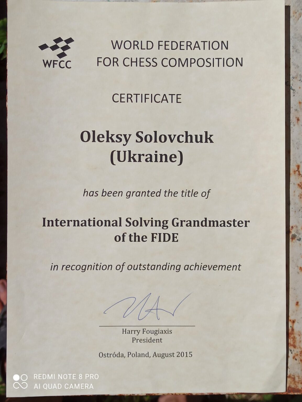 Сертифікат про присвоєння Олексію Соловчуку звання міжнародного гросмейтера / фото polvisti